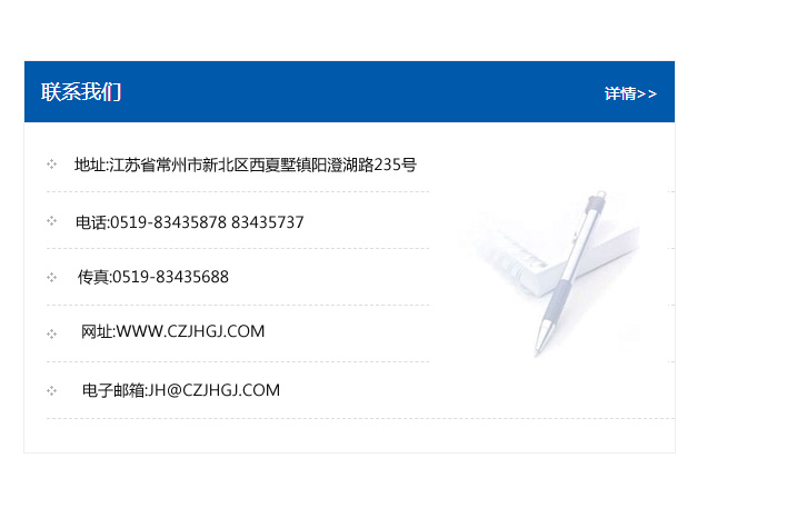 傳真:0519-83435688    郵編:213135    網(wǎng)址:WWW.czjhgj_com.sh99y.com    電子郵箱:JH@czjhgj_com.sh99y.com